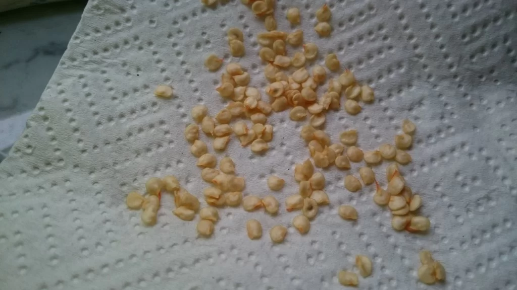 Här är fröna. Bilden tagen den 31 Januari.@Grannen Olsson Ta ut fröerna från en frukt som ser mest mogen ut, torka väl (lägg på toapapper i solen eller på ett element) en vecka eller så. Under tiden köp typ 20 små plastkrukor och plantjord (jag körde med helt vanlig plantjord) och när fröerna är torra så peta ner 2-3 fröer i varje kruka. Efter ett par veckor borde plantorna dyka upp. Kommer det fler än en så är det bara att rycka bort den svagare (minsta) plantan. Skulle du få plantor i alla krukor så har du lite att ge bort till vänner och bekant till våren.