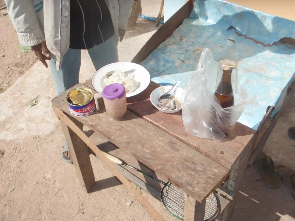 Här har han dukat fram ris o surströmming åt sig själv :D
