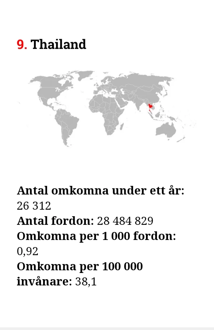 I Sverige är siffran ca 3 per 100 000 innevånare mot Thailands 38 per 100 000 så skillnade är väldigt stor, det EU land som har mest omkomna i trafiken är Polen som kommer upp i närmare 10 omkomna per 100 000.