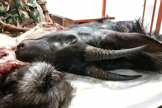 The head and other body parts of a serow recovered in a raid on Saturday in Kaeng Krachan National Park are displayed at a park office in Kaeng Krachan district of Phetchaburi province