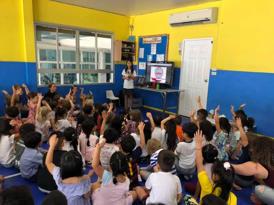 Lilly Satidtanasarn teaching Kindergarten students about the need to eliminate single-use plastic in society. Photo from Facebook page of Bye Bye Plastic Bags Thailand