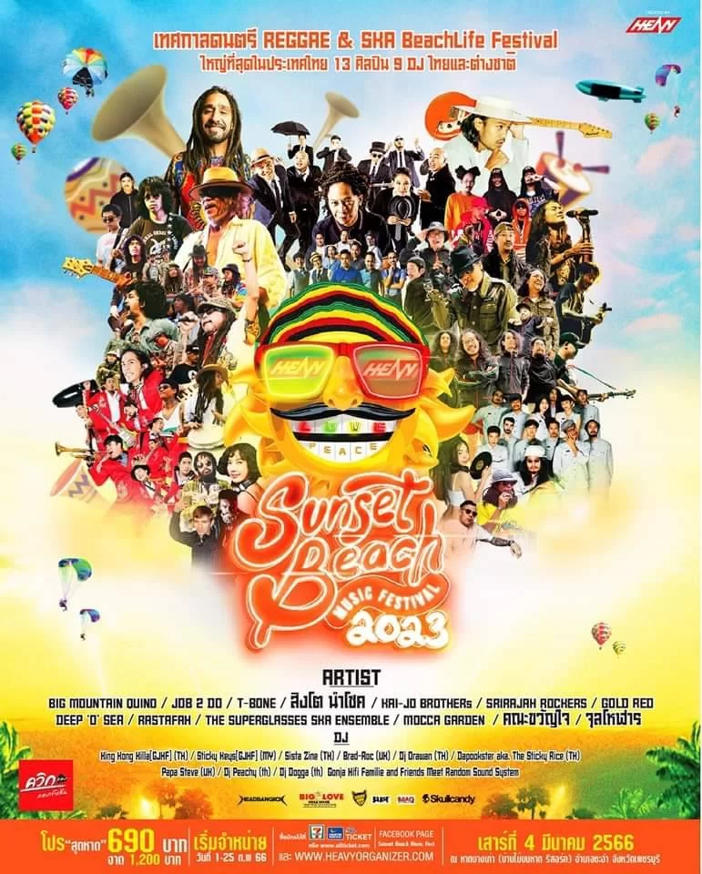 Sunset Beach Music Festival 2023 i Cha-am hålls den 4 mars på Bang Kao Beach, det är Thailands största reagge festival.